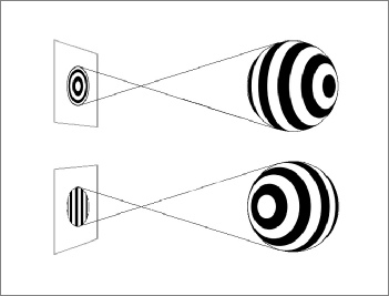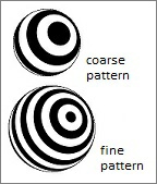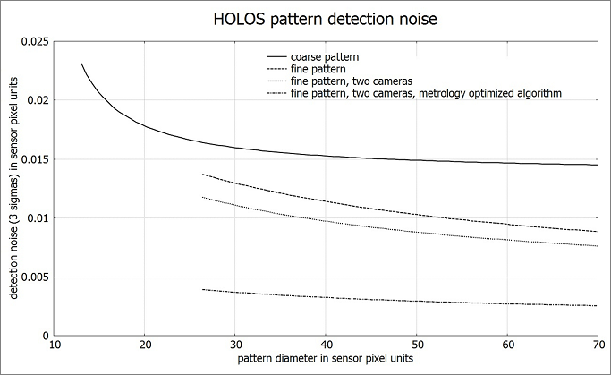 The core advantage of the HOLOS detection algorithm derives from the exceptionally high precision and robustness at which it can distinguish very slight subpixel changes of the pattern’s position, diameter and band curvature in the camera image even if the pattern appears small, pixelated and moderately out of focus. With a fine band structure on the sphere as indicated in the image to the right, pattern movements on the sensor smaller than 1/100th of a pixel unit can be detected. The accuracy even improves to better than 1/300th of a pixel unit when our Metrology optimized HOLOS algorithm is used together with a stereo setup, where twice as much pixel information is available.
